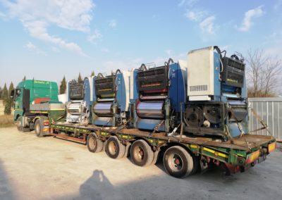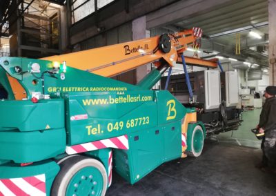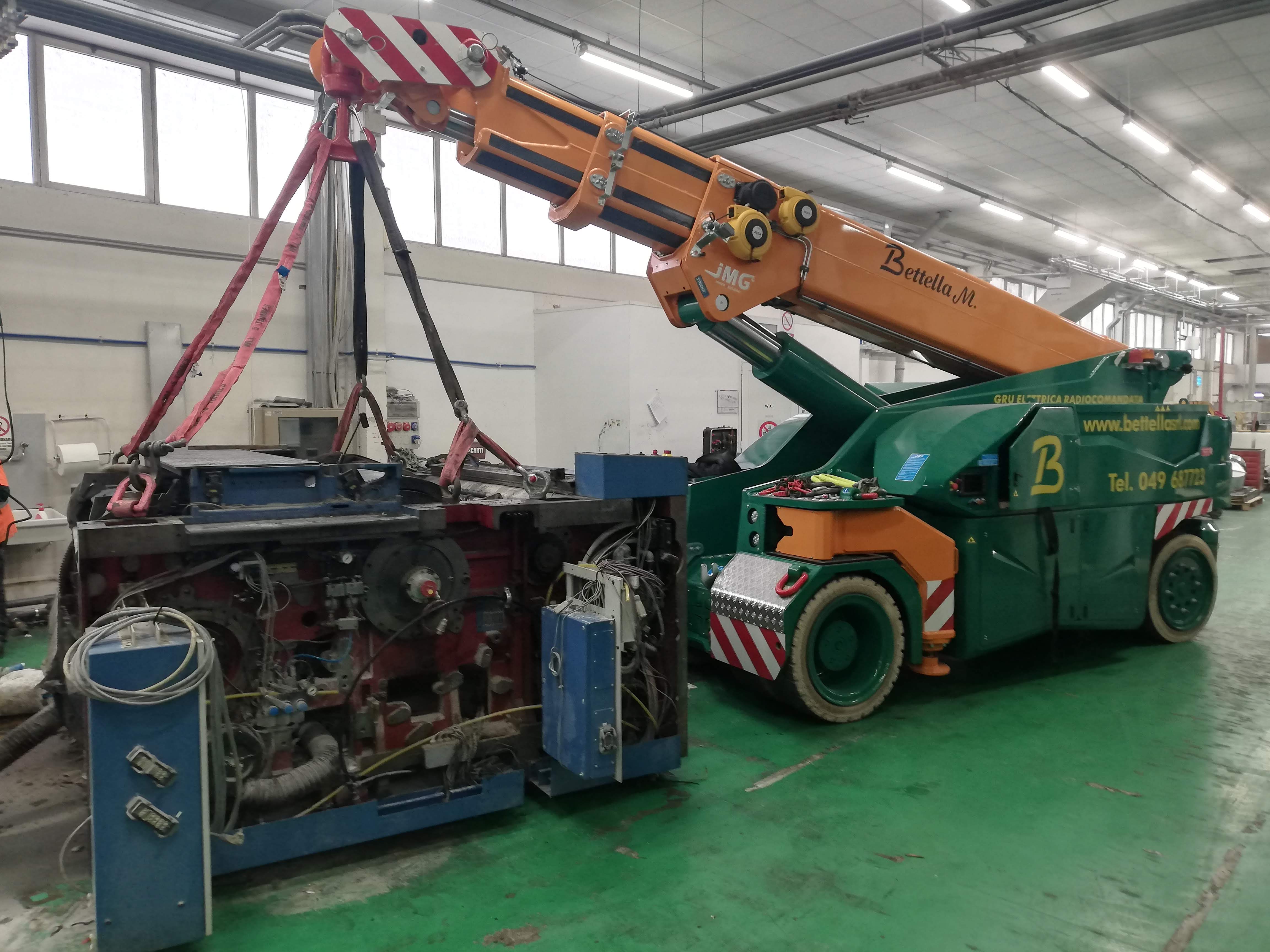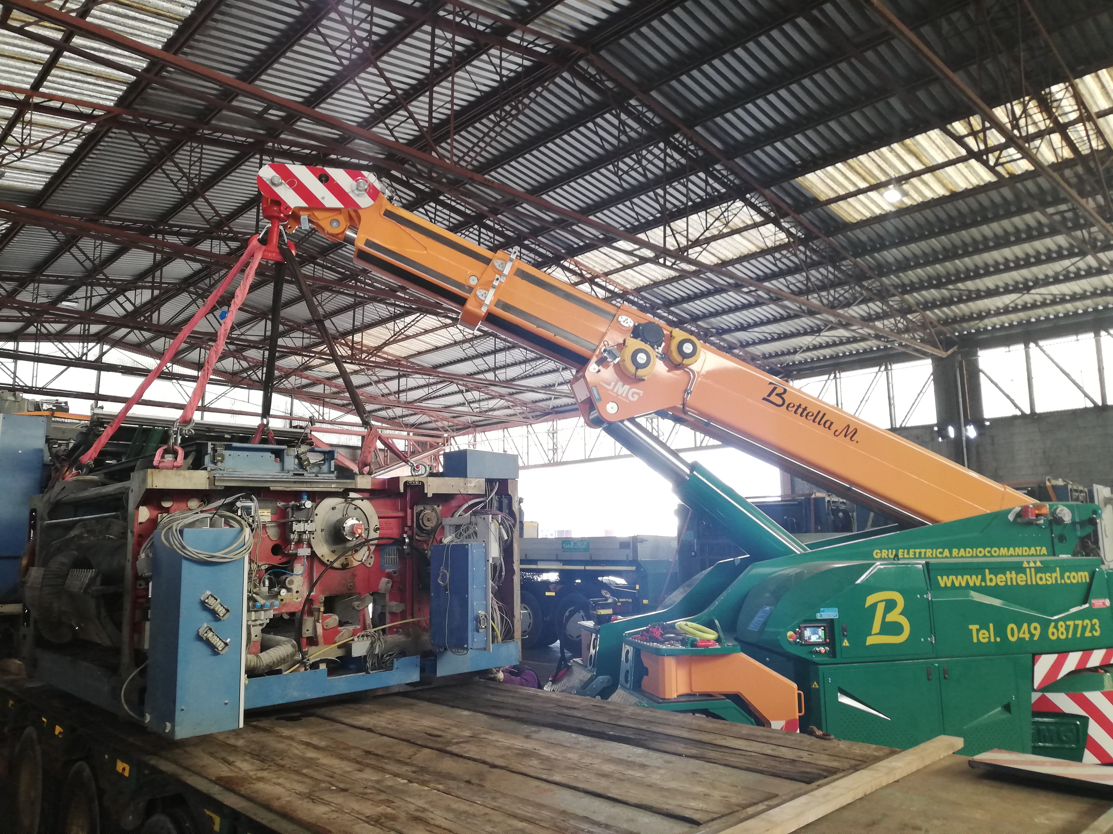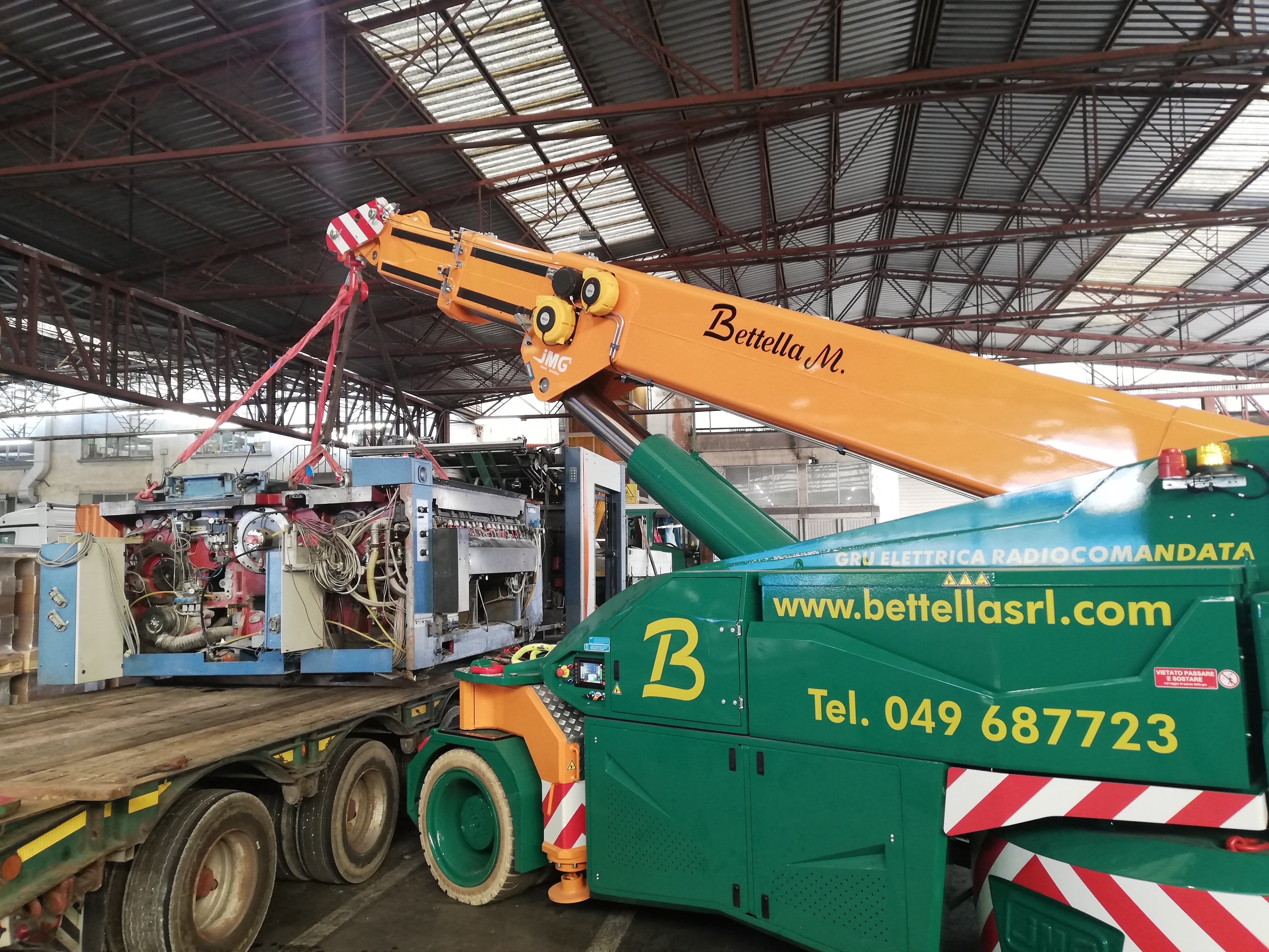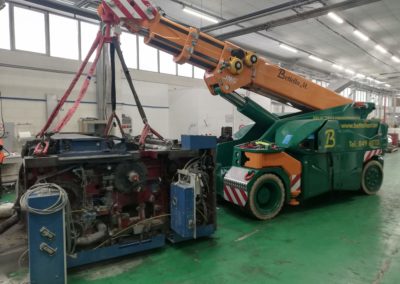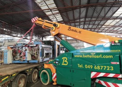 Ricollocazione macchinari industriali da stampa con l’impiego di gru elettrica JMG 300 e varie attrezzature elettriche oltre all’impiego di nostri mezzi per trasporto e sollevamento dei pezzi e bilici.