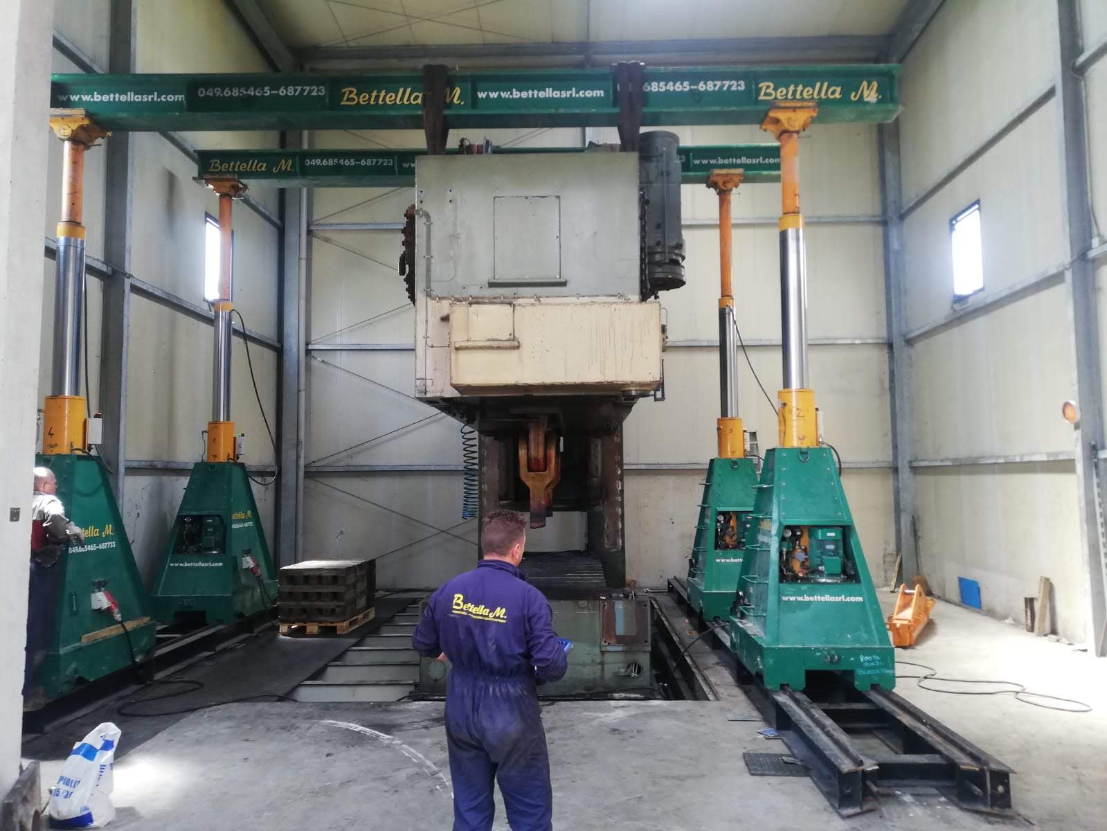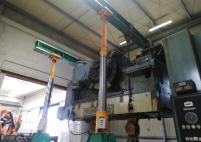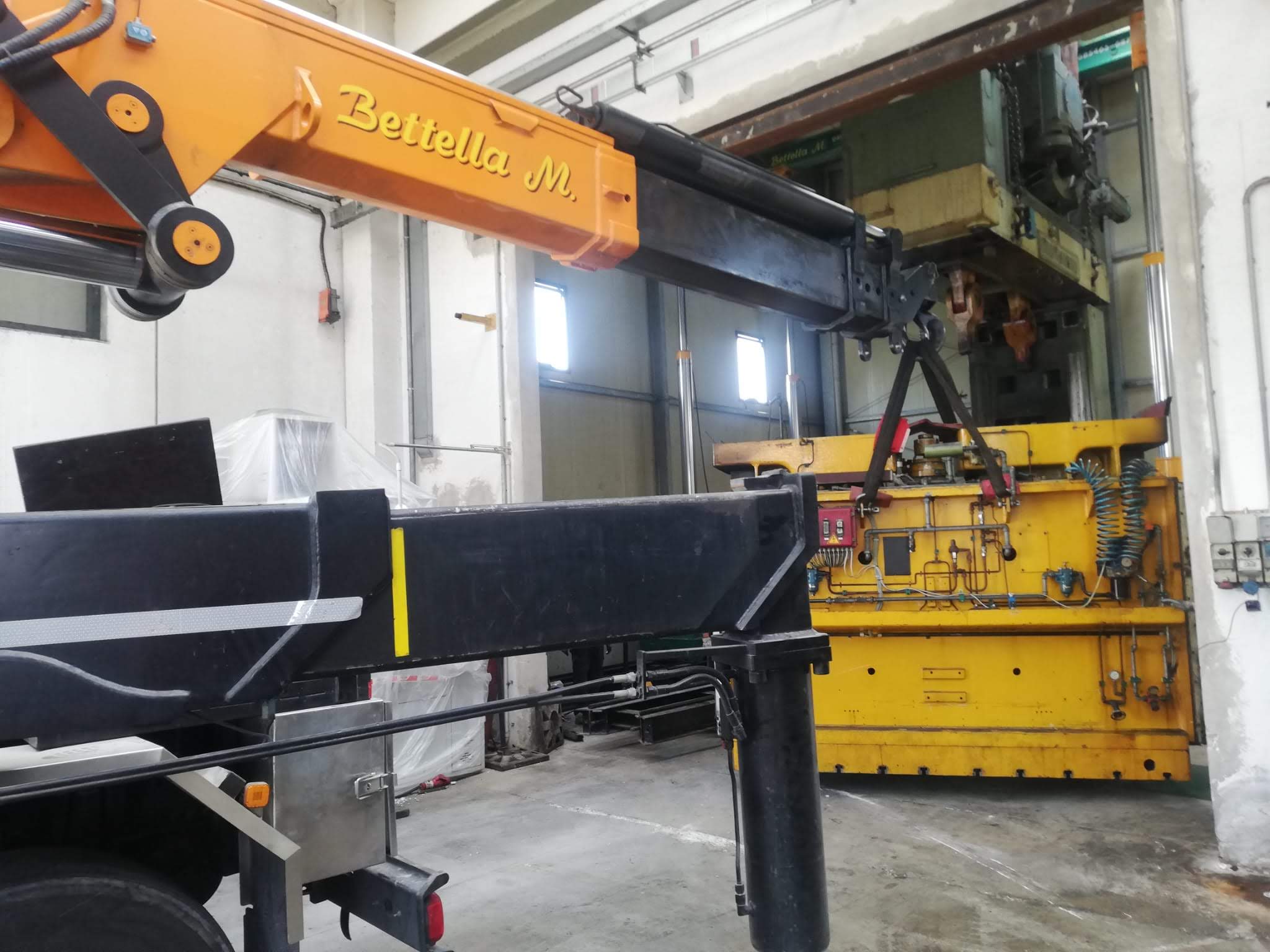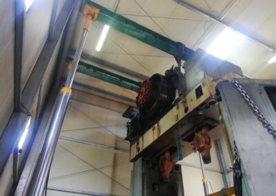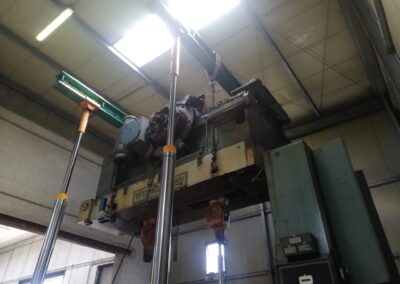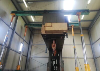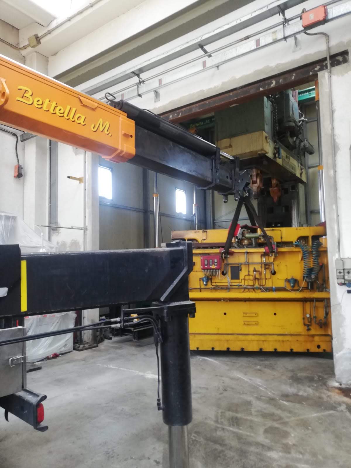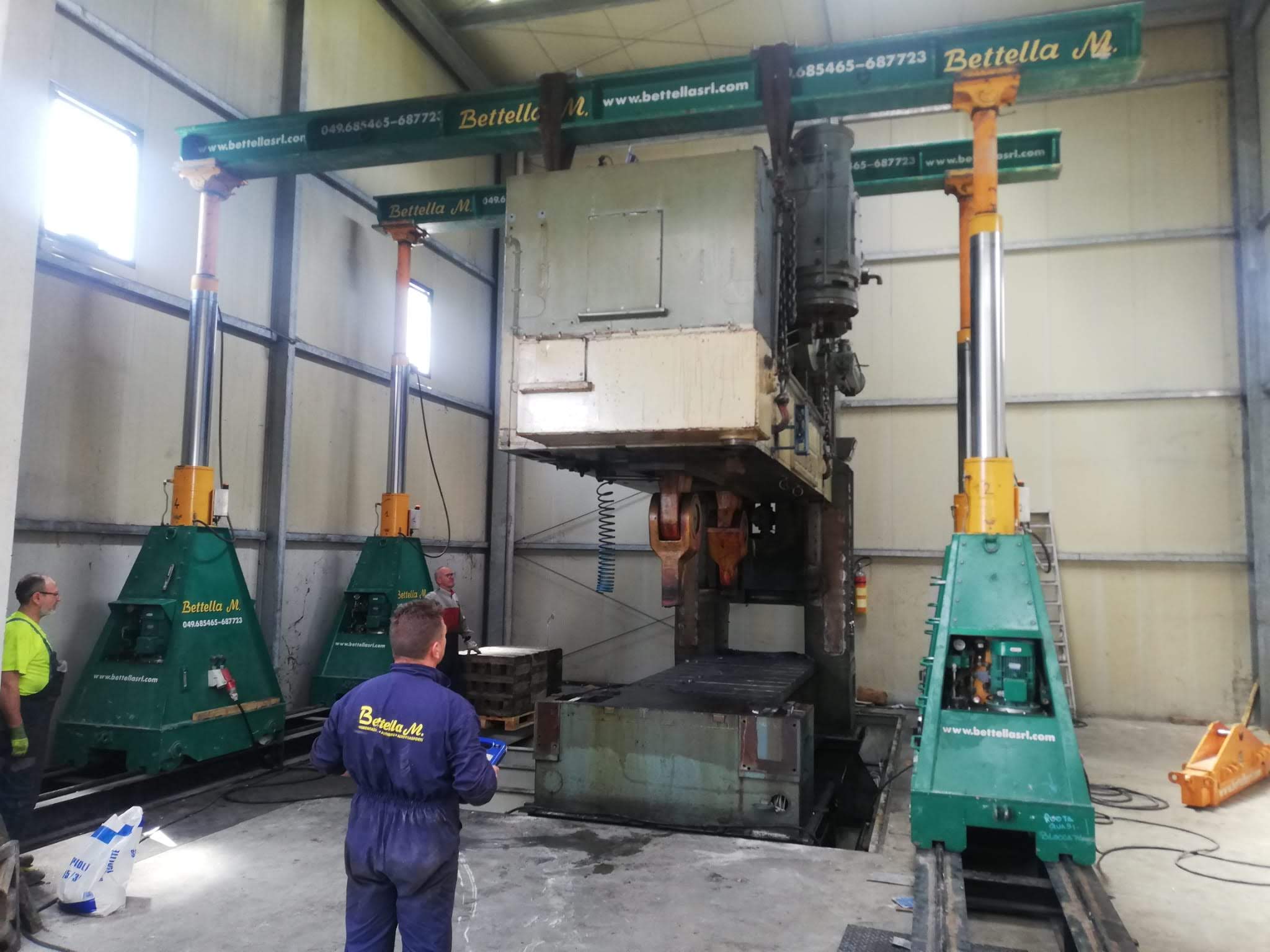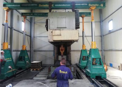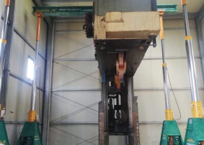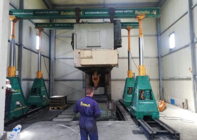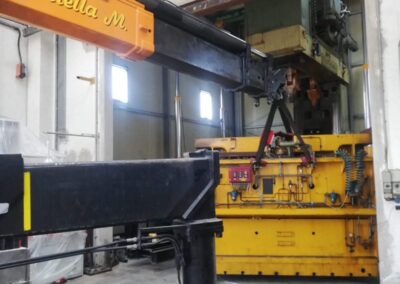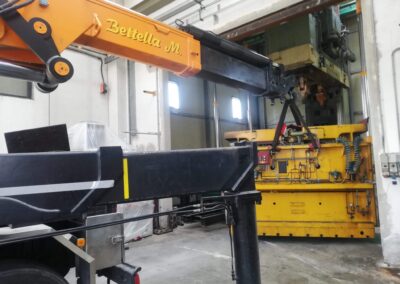La pressa è stata smontata ed estratta dalla sua posizione, grazie a sollevatori idraulici che hanno permesso di svolgere il lavoro senza apertura del capannone, nè del tetto nè delle pareti. Carico con gru elettrica JMG su mezzi.