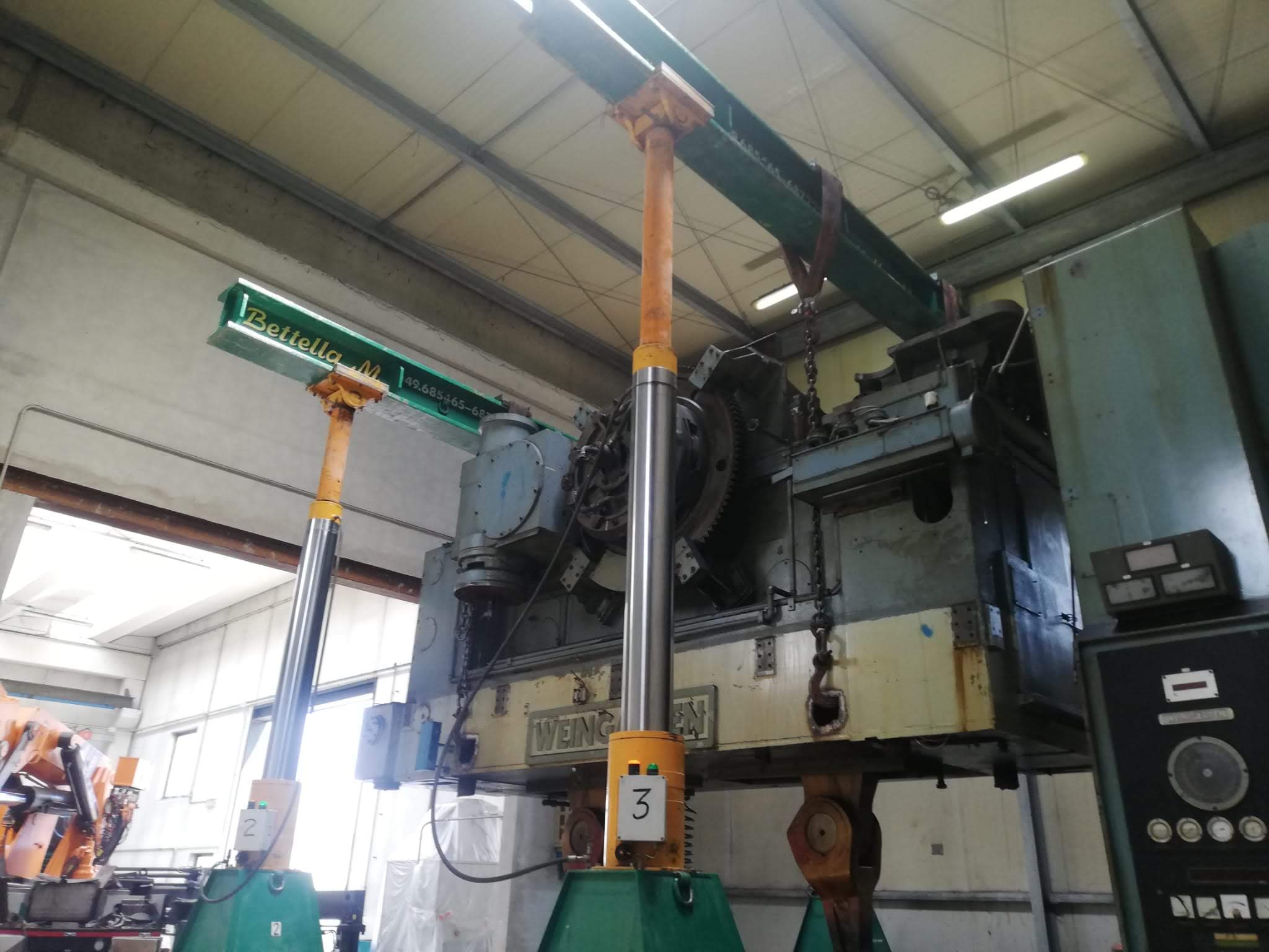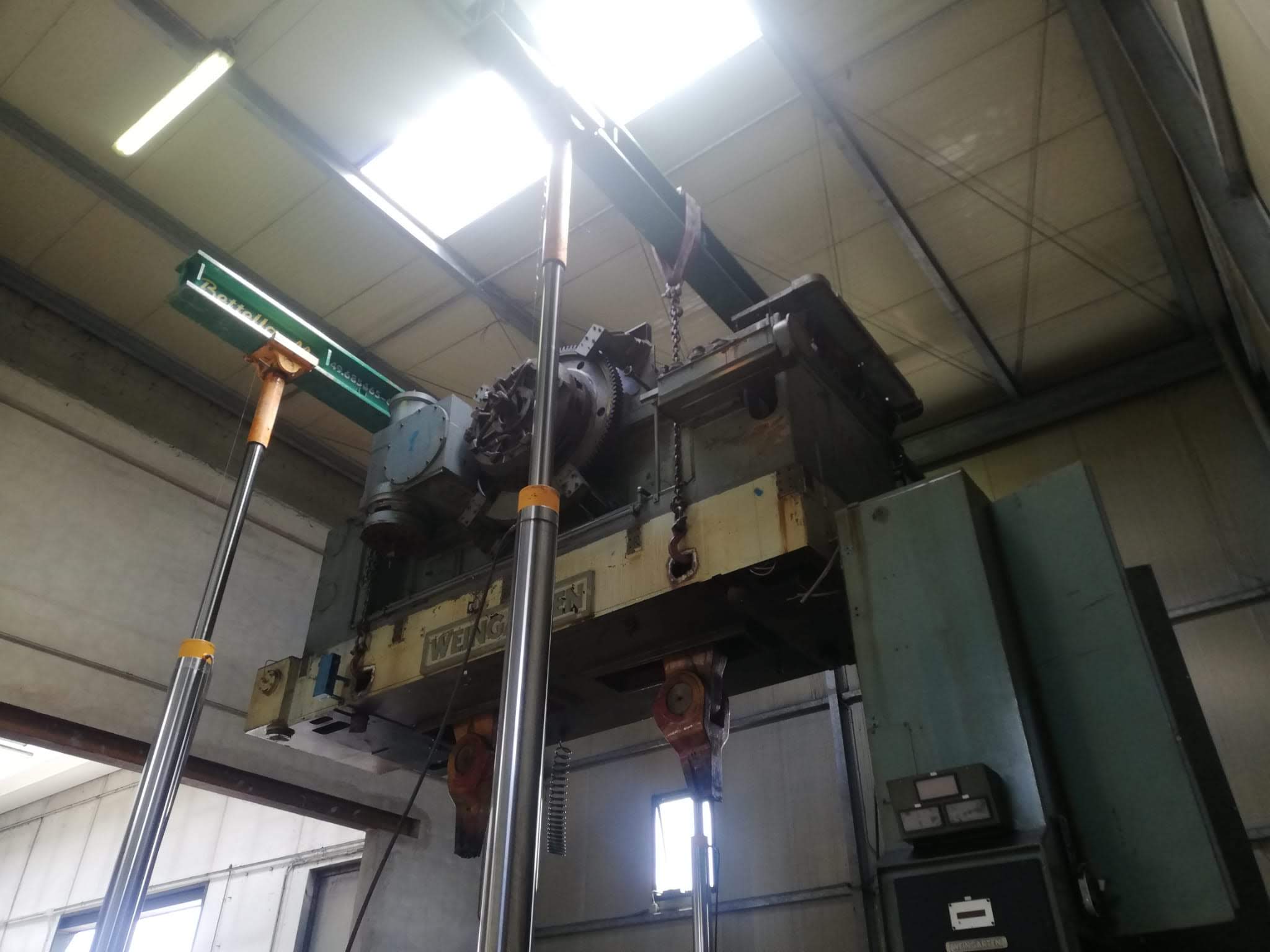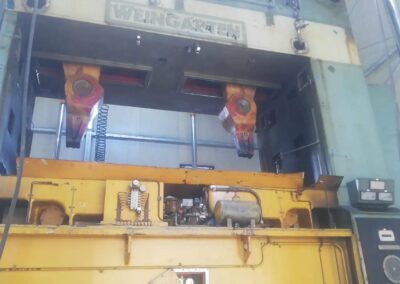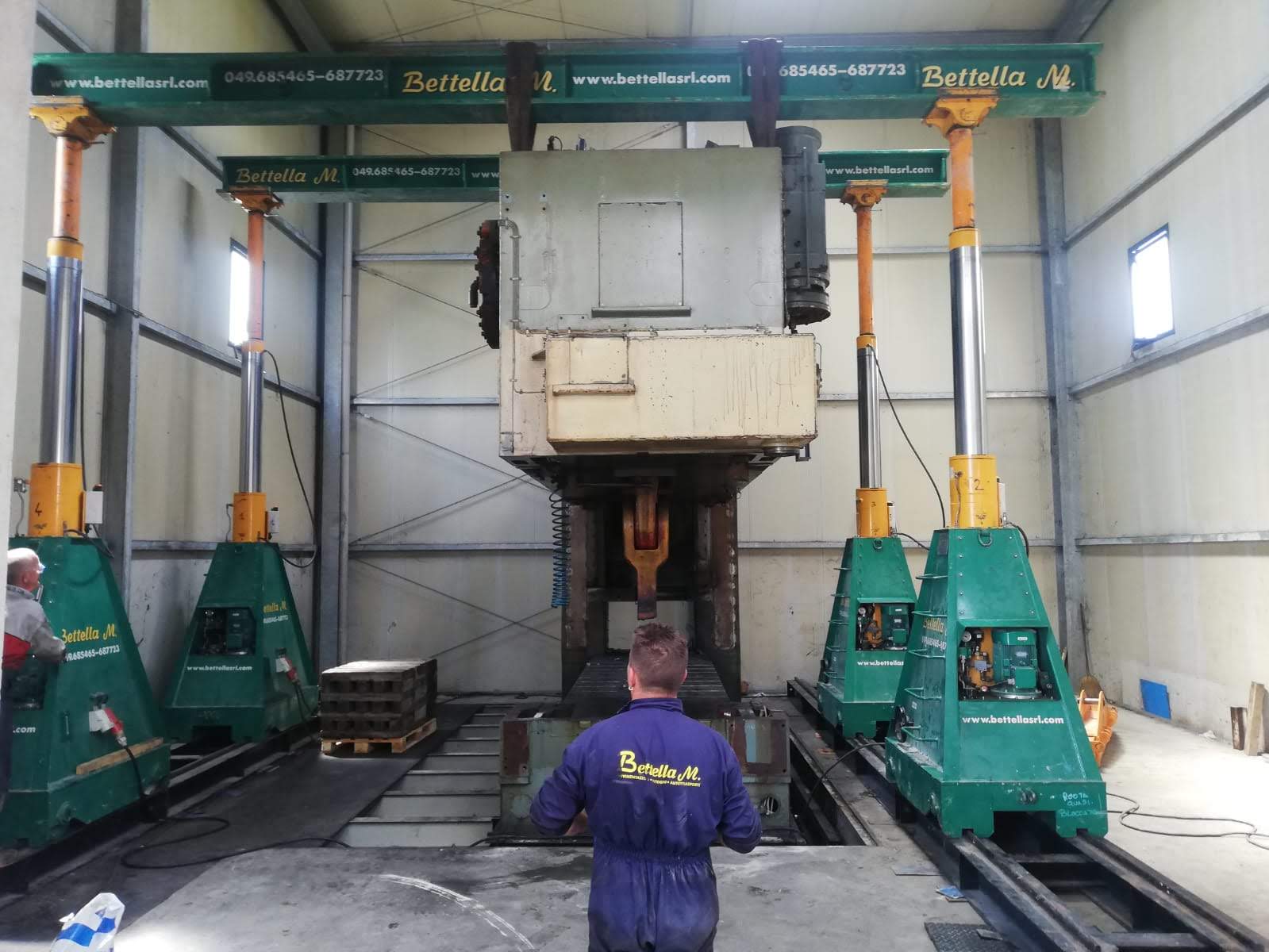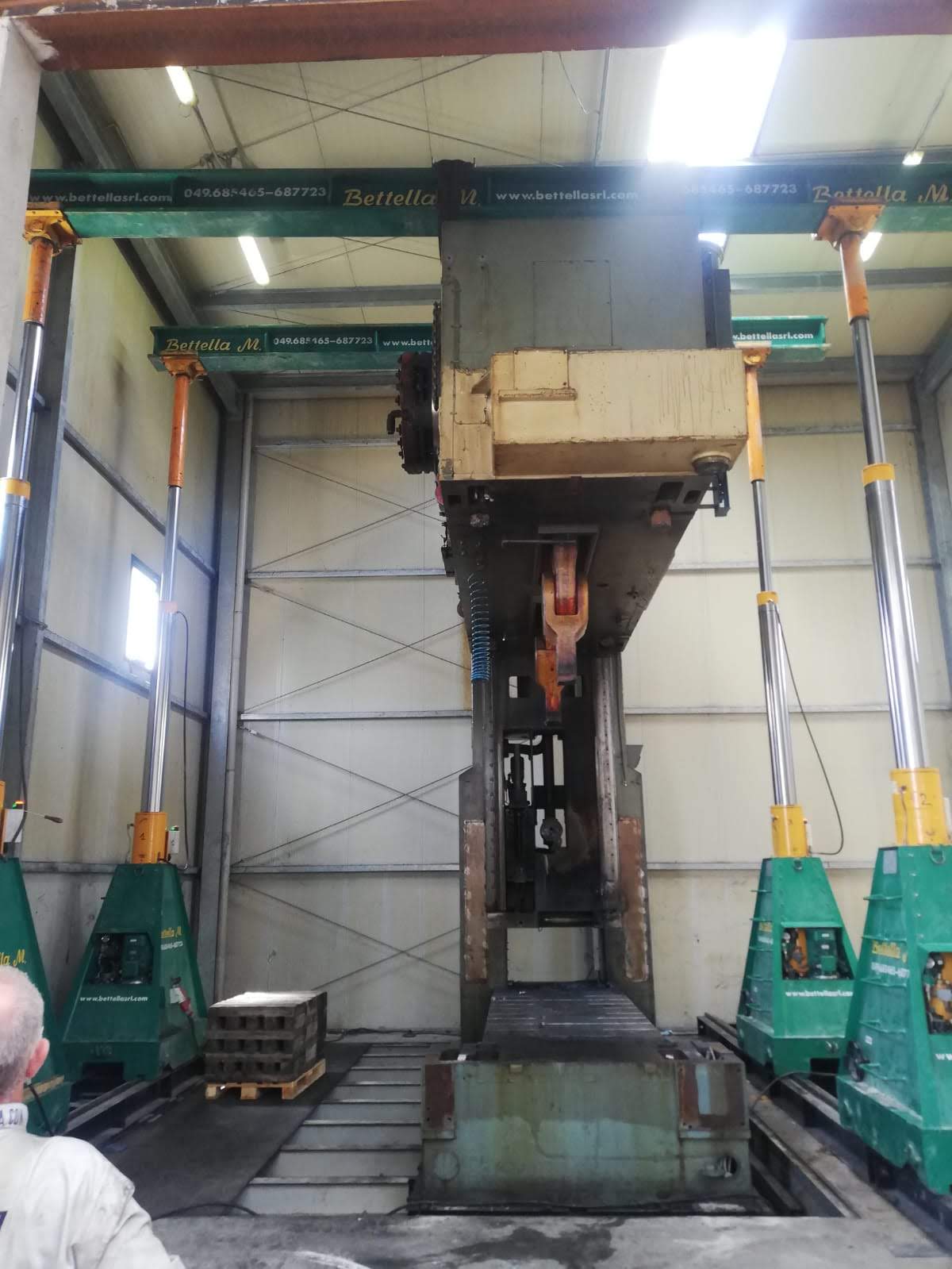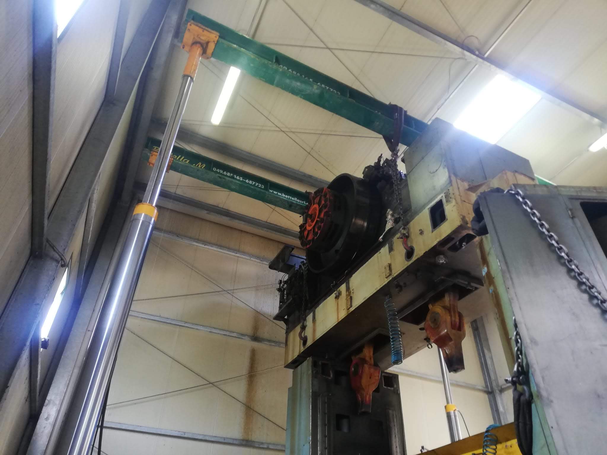 La pressa è stata smontata ed estratta dalla sua posizione, grazie a sollevatori idraulici che hanno permesso di svolgere il lavoro senza apertura del capannone, nè del tetto nè delle pareti. Carico con gru elettrica JMG su mezzi.
