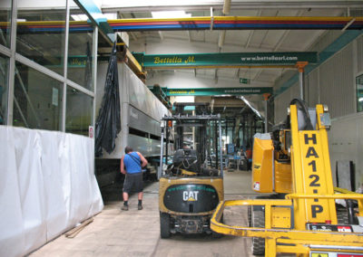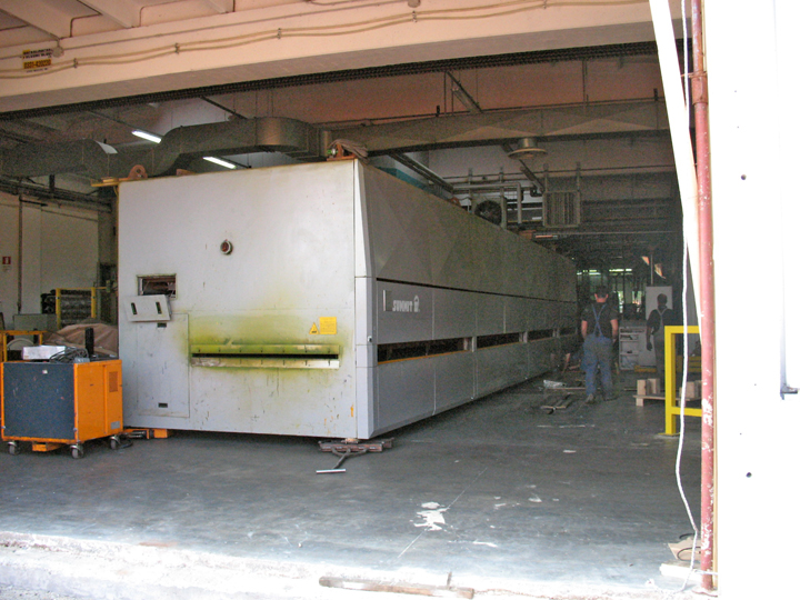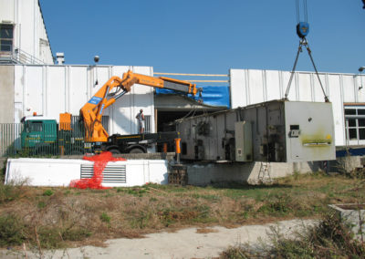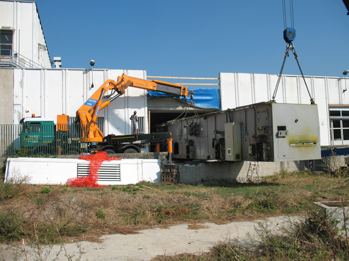 Sollevamento eccezionale di un forno con inoltro nel capannone tramite due Gru su automezzi. Posizionamento con cavallette idrauliche e Apollo 30.